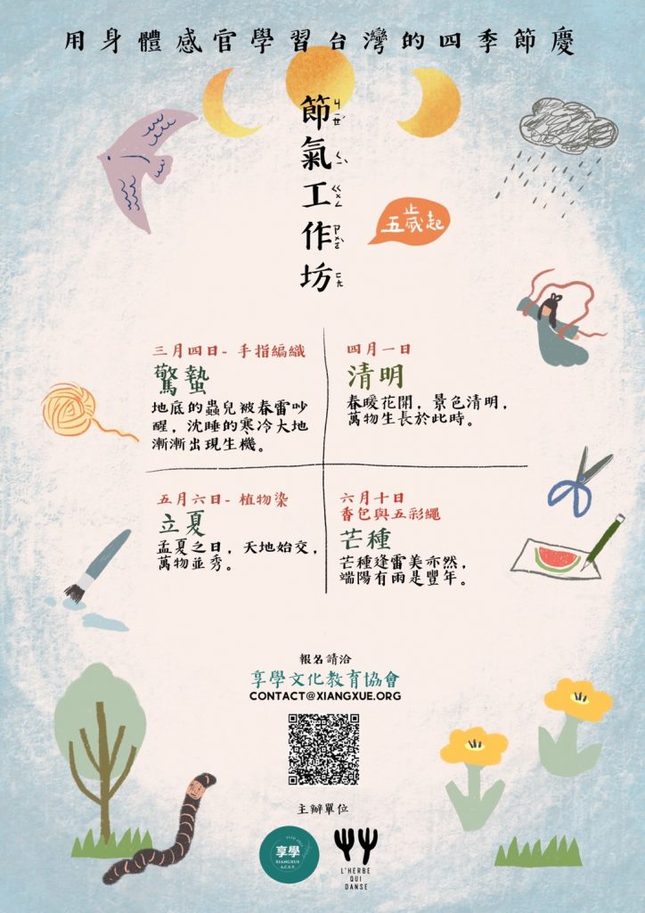 春耕、夏耘、秋收、冬息,四季的韻律與傳統農業社會的作息,揉合了老祖宗的智慧,演變成現今多采多姿的節慶。今年推出這一系列的【節氣兒童工作坊】以台灣用來標記季節變化的二十四節氣為基底,帶孩子們製作當下民俗節日相關的各種工藝品,例如手指編織、植物染、縫香包等。手工藝製作鍛鍊孩子的意志力與手腦協調能力,他們將使用簡單、天然的材料,耐心製作出屬於自己的珍貴作品。