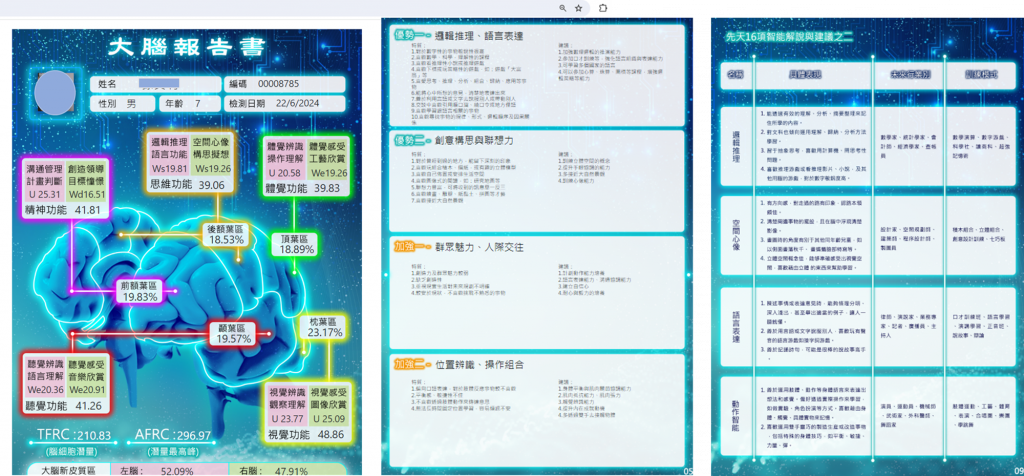 • 檢測報告:採樣後3-5個工作日內,您將收到一封電子郵件,內含當天設置的帳號和密碼,供您登入查看報告。這份報告終生受用,請妥善保存。您將獲得一份精美且詳細的電子報告,內容包括:(前額葉-精神功能、後額葉/思維功能、頂葉/體覺功能、顳葉/聽覺功能、診頁/視覺功能)、個性分析與人格特質、先天學習風格、主性格型態、調整引導、九大智慧、先天16項智能解說(言語智能、邏輯數學智能、空間智能、音樂智能、肢體動覺智能、人際智能、自然觀察智能、內省智能等)、後天多元智能的綜合評估及分析。整份報告約26頁,只需使用採樣時設定的帳號和密碼即可隨時查看。