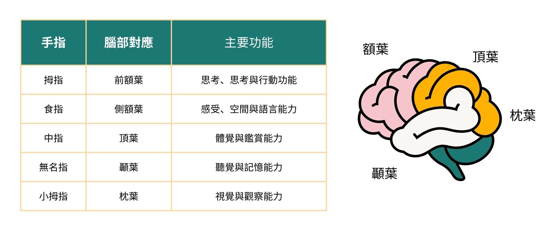 食指代表後額葉腦,負責邏輯、思考、表達能力