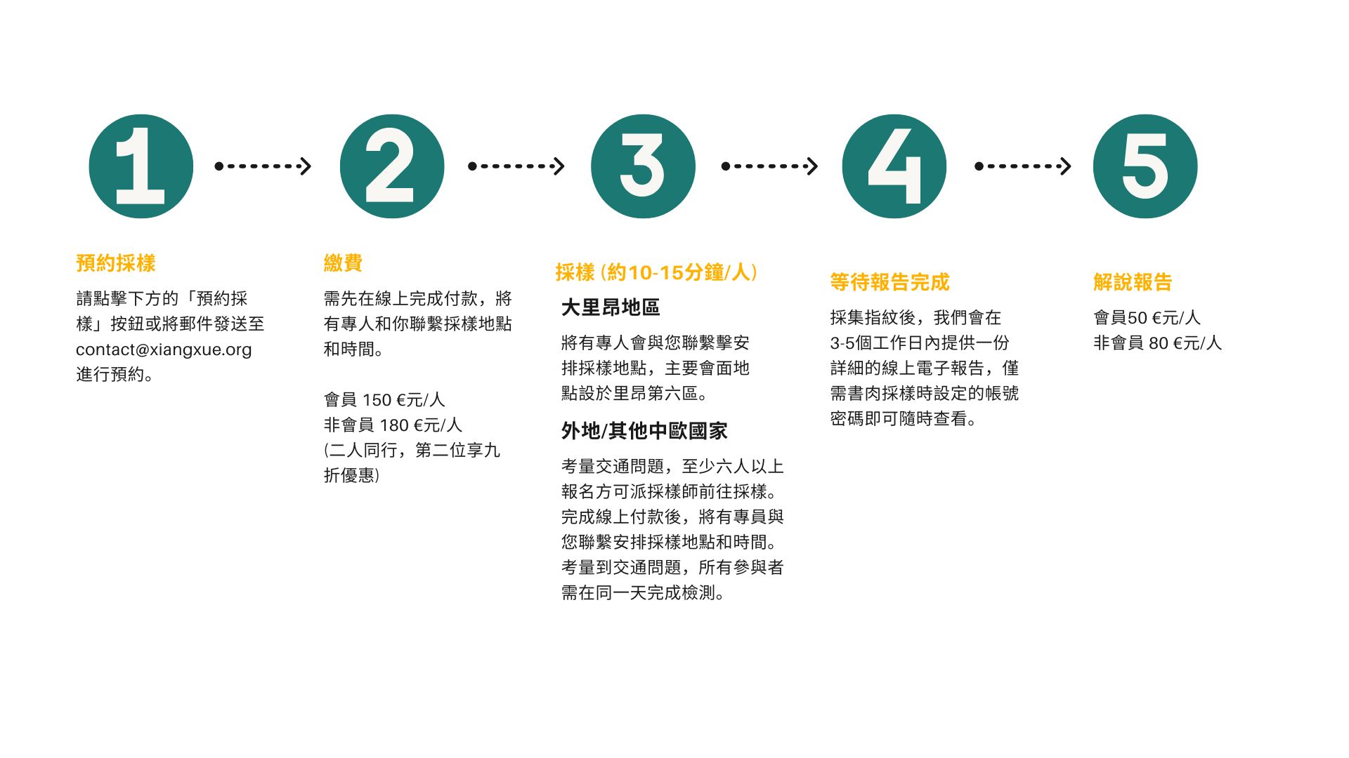 • 採樣流程 : 將手指頭依序放置到皮紋檢測儀器,靜待指紋採集後,即完成採樣,僅需10-15分鐘。