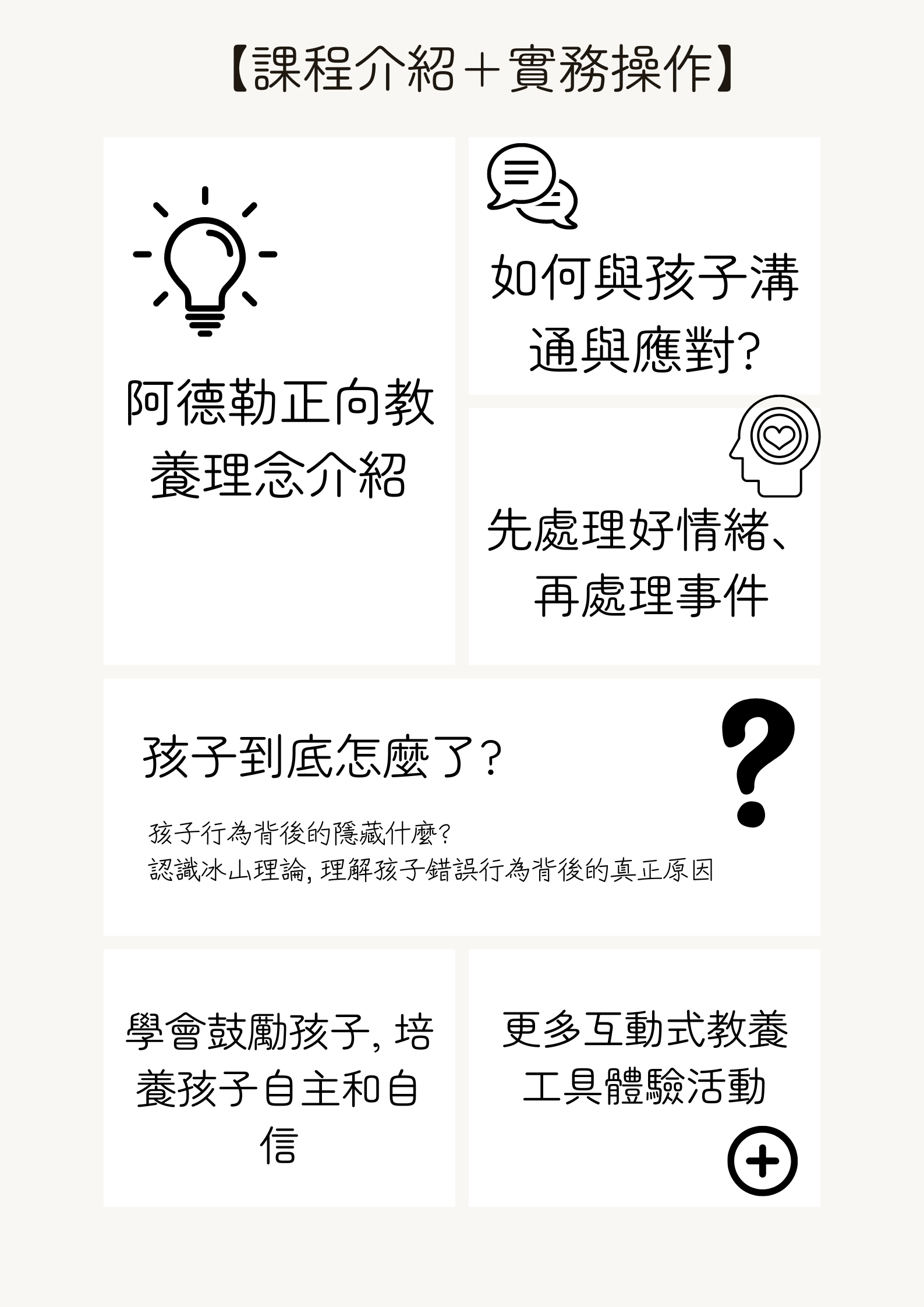 本場簡短的講座將介紹一到二種能改變父母和孩子生活的正向教養(正面管教)工具。您將有機會參與一項體驗式活動,幫助父母進入孩子的世界,更深入了解什麼有效,什麼無效。